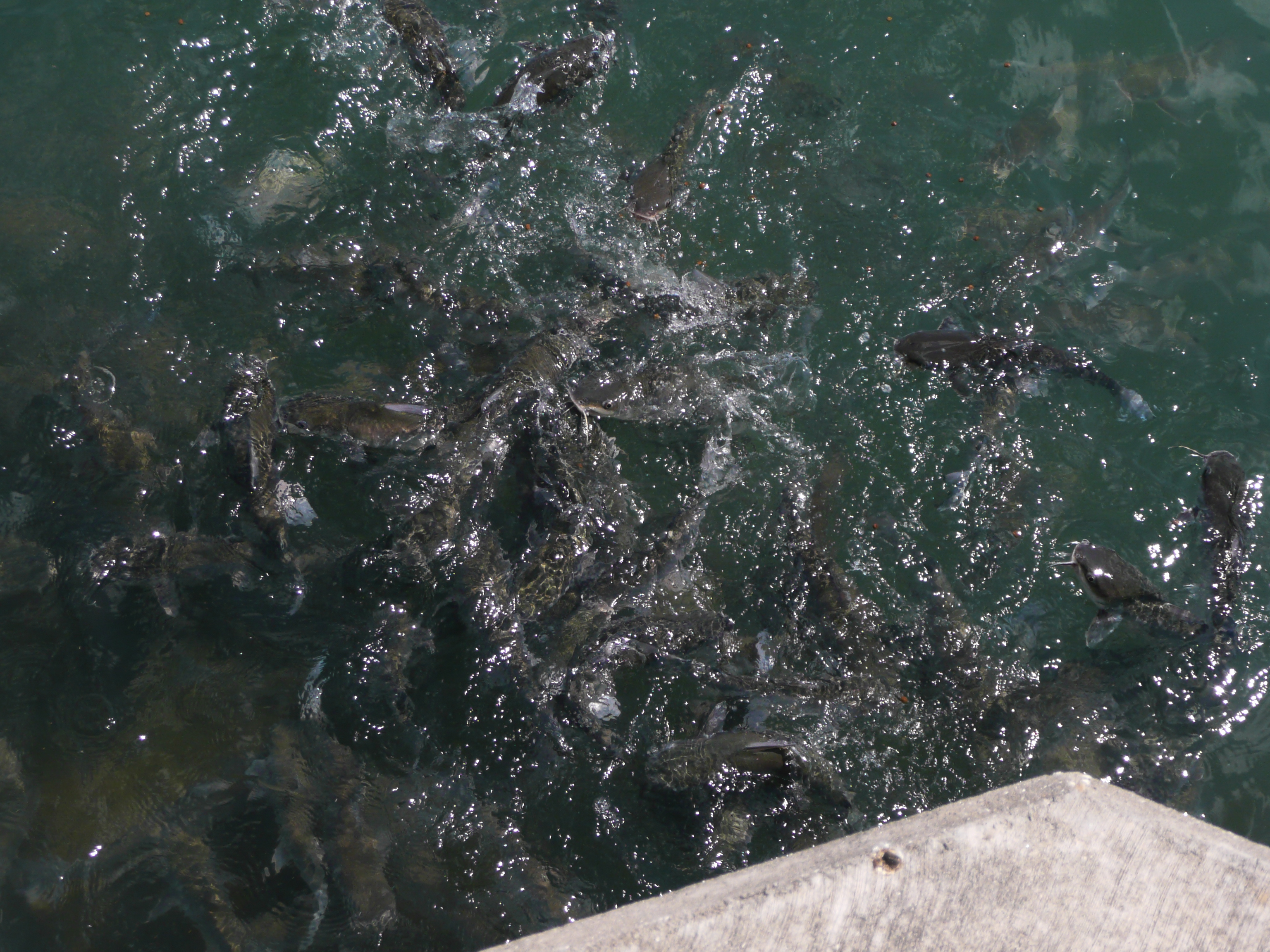 Here, an old man was feeding bread rolls to the seagulls that swooped in to catch the bounty. As he left he handed us some left over bread to finish throwing. As we threw the bread it became obvious that a few catfish were gulping up bread the gulls missed.